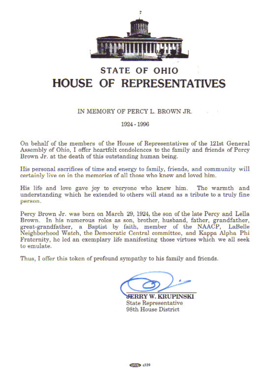 Percy strongly believed that he could make a difference in his community where he was extremely active. Percy was a member of the Second Baptist Church, the NAACP, the Labelleview Neighborhood Watch Committee, the Prince Albert Lodge #232 and the Democratic County Central Committee. He ran twice for Councilman in the 1st ward. He served too as a Special Police Officer and as volunteer football and basketball coaches. Percy retired from Wheeling Pittsburgh Steel Corporation as a Laboratory Chemist.